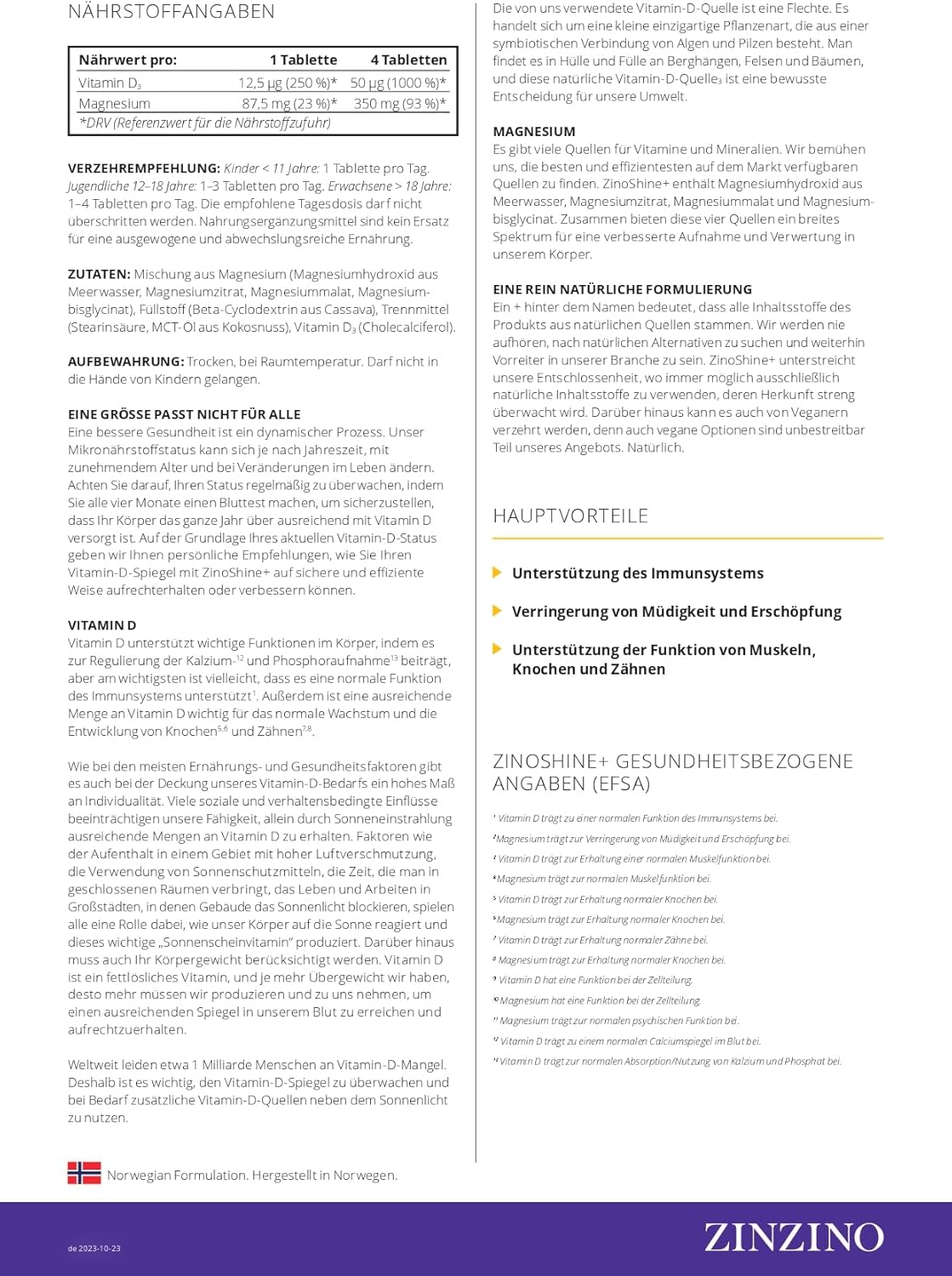 ZinoShine+ is a natural dietary supplement with vegan vitamin D3 from wild lichen and a broad-spectrum magnesium complex. The formula supports the immune system, helps reduce fatigue, and contributes to the normal function of muscles, bones, and teeth. The dosage is flexibly adjustable depending on the season and individual needs.
